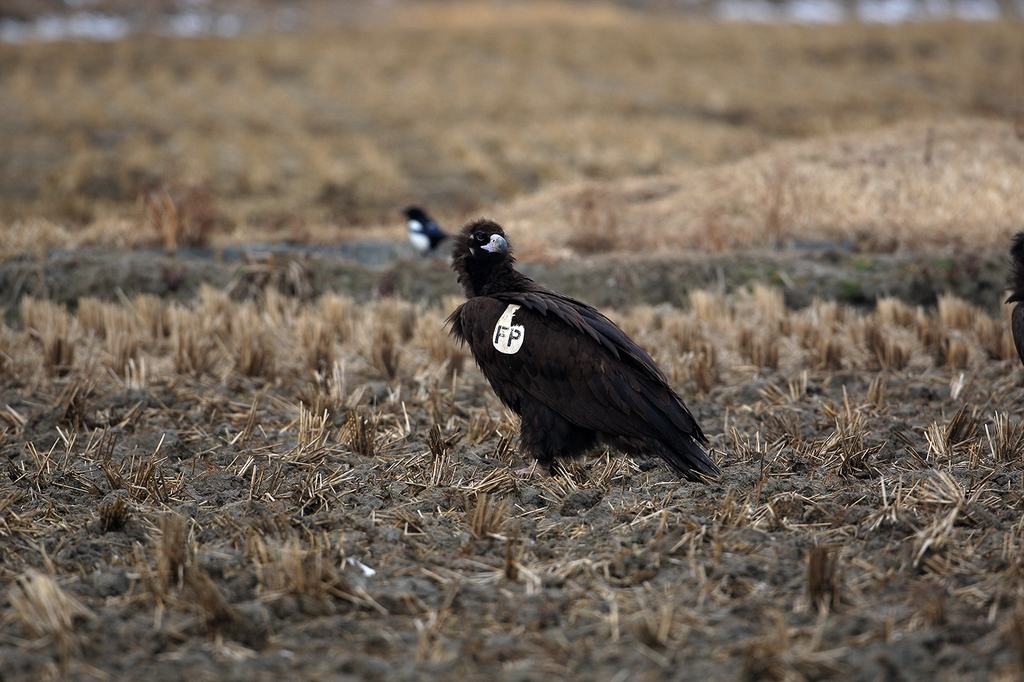 25일 서산시에 따르면 전국적인 고병원성 조류인플루엔자(AI) 발생에 대비해 지난 22일 천수만 간척지 철새도래지에 대한 상시 예찰 중 흰색 바탕에 검정 글씨로 'FP'라고 적힌 독수리 1마리가 카메라에 포착됐다.