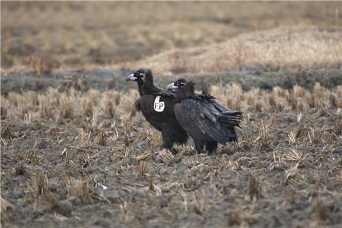 (서산=연합뉴스) 이은파 기자 = 국내 최대 철새도래지인 충남 서산시 천수만 간척지에서 윙택(날개 꼬리표)이 부착된 독수리(천연기념물 제243-1호)가 발견됐다.