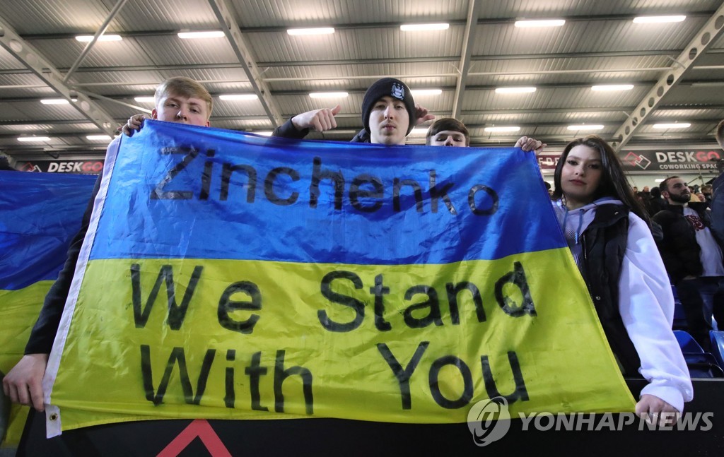 | ▲ 진첸코 응원 문구가 찍힌 우크라이나 국기를 든 팬들 [로이터=연합뉴스] |
