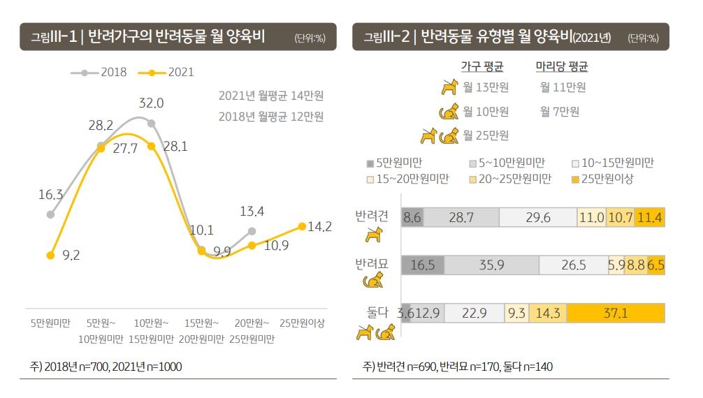 반려견 양육비는 월평균 11만원, 반려묘의 경우 7만원 수준이었다.