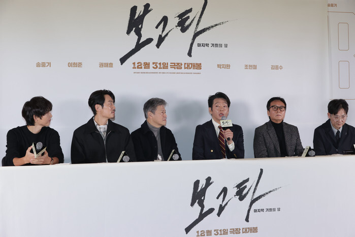 The stars of the new movie "Bogota: City of the Lost" -- Song Joong-ki, Lee Hee-jun, Kwon Hae-hyo, Park Ji-hwan and Kim Jong-soo (L to 2nd R) -- along with director Kim Sung-jae (R) -- speak during an event in Seoul on Dec. 19, 2024, to promote the movie, set to hit local screens in South Korea on Dec. 31. (Yonhap)