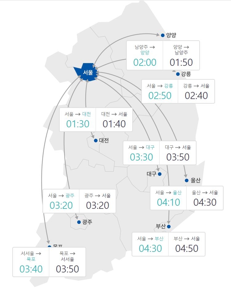 오전 9시에 승용차로 전국 주요 도시를 출발해 서울에 도착하기까지 걸리는 시간은 부산 4시간 50분, 광주 3시간 20분, 대구 3시간 50분, 강릉 2시간 40분 등으로 예상된다.