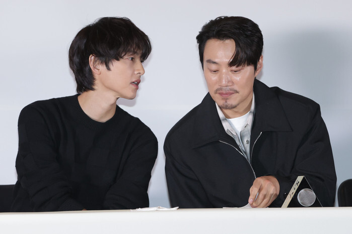 South Korean actors Lee Hee-jun (R) and Song Joong-ki, who star in the new movie "Bogota: City of the Lost," talk to each other during an event in Seoul on Dec. 19, 2024, to promote the movie, set to hit local screens in South Korea on Dec. 31. (Yonhap)