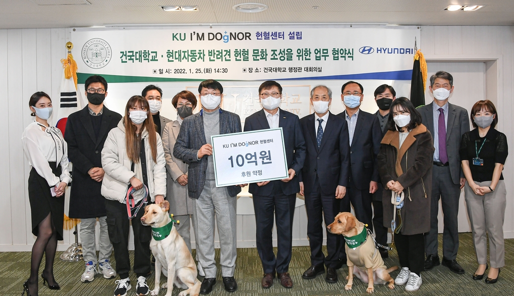 (서울=연합뉴스) 박성민 기자 = 현대차[005380]는 건국대와 업무협약(MOU)을 맺고 이 대학이 추진하는 반려견 헌혈센터 설립·운영을 위해 매년 2억원씩 5년간 총 10억원을 후원하기로 했다고 26일 밝혔다.