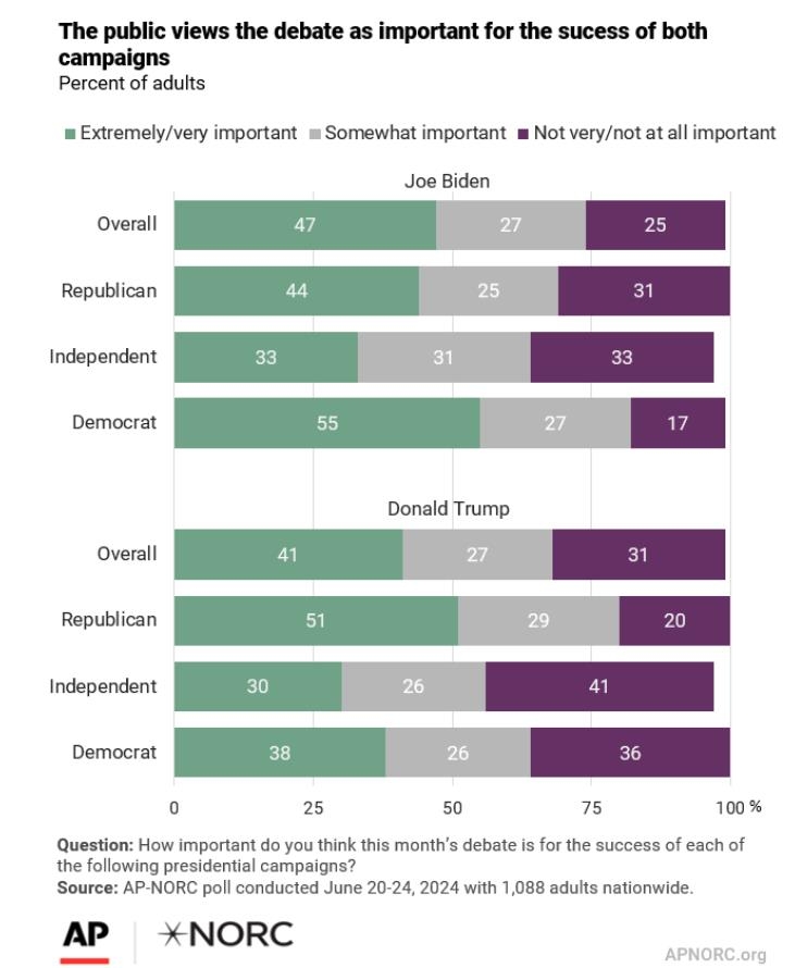 AP통신과 시카고대 여론연구센터(NORC)가 지난 20~24일 1천88명 유권자를 대상으로 진행해 26일 공개한 결과에 따르면 유권자의 74%가 '이번 토론이 바이든 대통령의 선거 운동의 성공에 매우 혹은 어느 정도 중요하다'고 답했다.