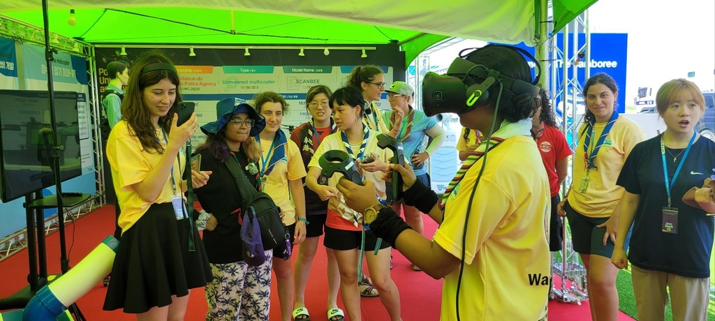 | ▲ VR 체험하는 스카우트 대원들 (부안=연합뉴스) 20203 새만금 세계스카우트잼버리 참가자가 잼버리 행사장에 설치된 '첨단 경찰장비 전시 부스'에서 VR체험을 하고 있다. [전북경찰청 제공. 재판매 및 DB 금지] |