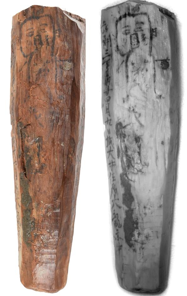 | ▲ 목간에서 확인한 사람 그림 왼쪽은 디지털카메라 촬영본, 오른쪽은 적외선 카메라 촬영본 [양주시·기호문화재연구원 제공. 재판매 및 DB 금지] |