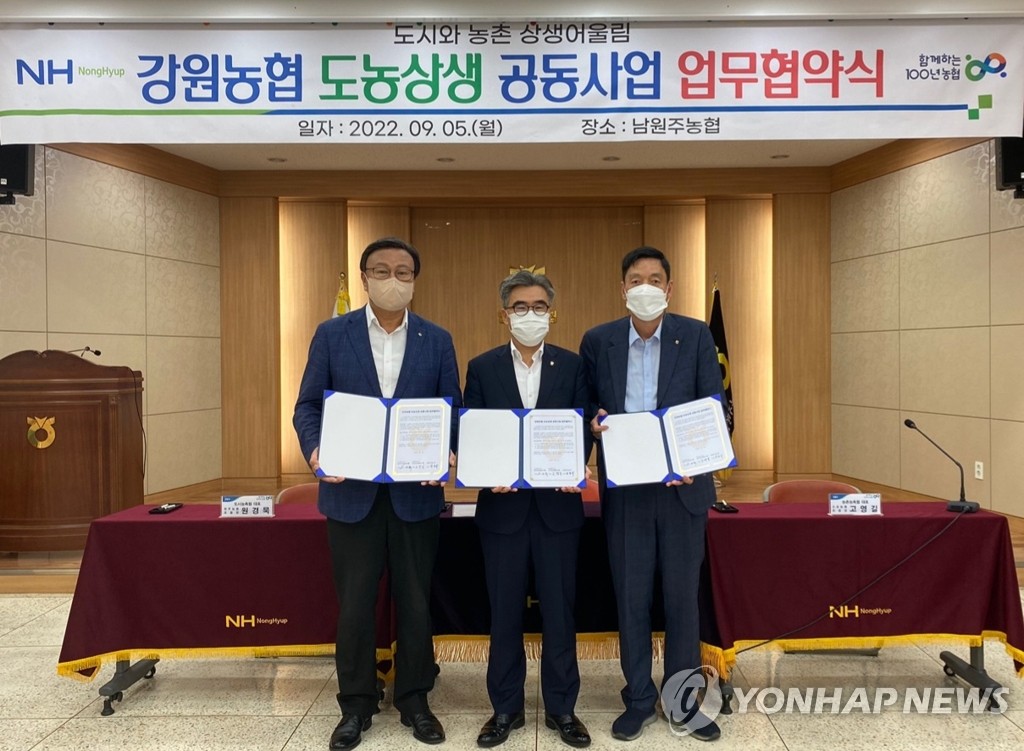 | ▲ 강원농협, 원주서 도농상생 공동사업 업무협약 지난해 9월 5일 도농상생 공동사업 업무협약식에서 원경묵 원주농협 조합장(왼쪽부터), 김용욱 농협 강원지역본부장, 최영집 소초농협 전무가 협약서에 서명한 뒤 기념 촬영을 하고 있다. [농협 강원지역본부 제공. 재판매 및 DB 금지] |