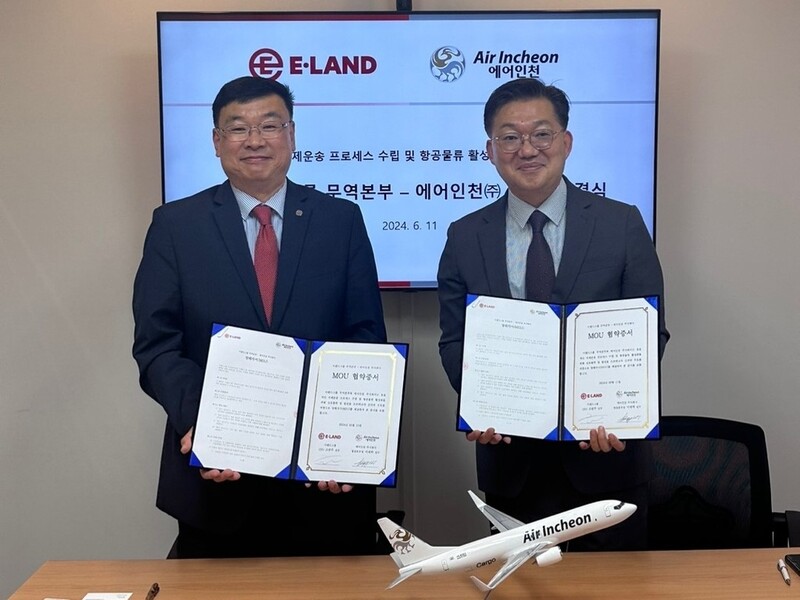 (서울=연합뉴스) 임성호 기자 = 에어인천은 11일 인천국제공항에서 이랜드그룹과 'K-패션 글로벌 항공물류 경쟁력 강화' 업무협약(MOU)을 체결했다고 밝혔다.