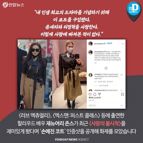 영화 '러브 액츄얼리, '엑스맨: 퍼스트 클래스' 등에 출연한 할리우드 배우 재뉴어리 존스가 최근 '사랑의 불시착'을 재미있게 봤다며 '손예진 코트' 인증샷을 공개해 화제를 모았습니다.