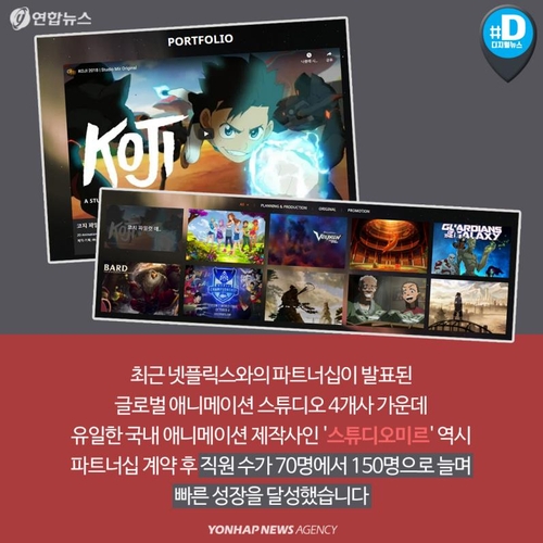 최근 넷플릭스와의 파트너십이 발표된 글로벌 애니메이션 스튜디오 4개사 가운데 유일한 국내 애니메이션 제작사인 '스튜디오미르' 역시 파트너십 계약 후 직원 수가 70명에서 150명으로 늘며 빠른 성장을 달성했습니다.