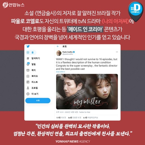 소설 '연금술사'의 저자로 잘 알려진 브라질 작가 파울로 코엘료도 자신의 트위터에 tvN 드라마 '나의 아저씨'에 대한 호평을 올리는 등 '메이드 인 코리아' 콘텐츠가 국경과 언어의 장벽을 넘어 세계적인 인기를 얻고 있습니다.