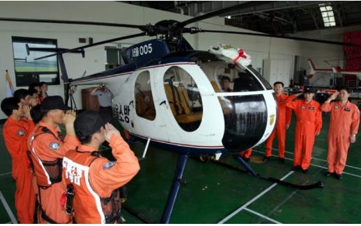 | ▲ 국내 최초 소방헬기 퇴역식 국내 최초 소방헬기인 '까치2호'가 2005년 6월 30일 퇴역식에서 항공대원들의 거수경례를 받는 모습. [소방청 제공. 재판매 및 DB 금지] |