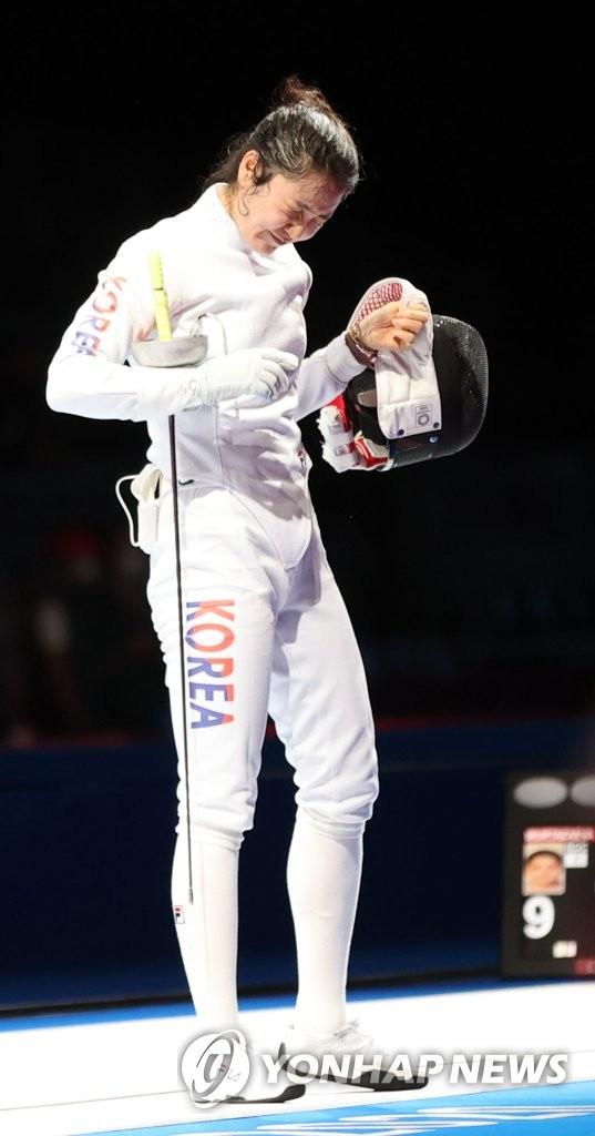 | ▲ Choi In-jeong of South Korea takes a break during her 15-11 loss to Aizanat Murtazaeva of the Russian Olympic Committee in the round of 32 at the women's individual epee event at the Tokyo Olympics at Makuhari Messe Hall B in Chiba, Japan, on July 24, 2021. (Yonhap) |