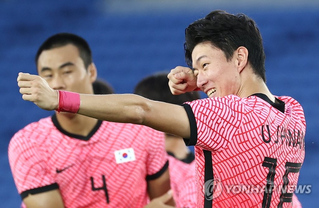 | ▲ Hwang Ui-jo of South Korea celebrates his goal against Honduras during the teams' Group B match at the Tokyo Olympic men's football tournament at International Stadium Yokohama in Yokohama, Japan, on July 28, 2021. (Yonhap) |
