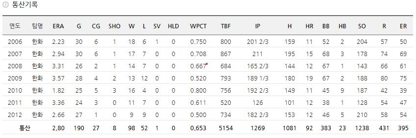 하지만 단 한 번도 100이닝을 던진 적이 없다.