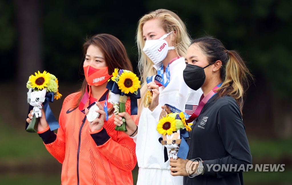 | ▲ [올림픽] 여자골프 메달 주인공들 (도쿄=연합뉴스) 한상균 기자 = 도쿄올림픽 여자 골프 금메달은 세계 랭킹 1위 넬리 코다(미국)가 차지했다. 은·동메달은 공동 2위로 연장전을 벌인 이나미 모네(일본)와 리디아 고(뉴질랜드)가 차지했다. 7일 일본 가스미가세키 컨트리클럽에서 열린 도쿄올림픽 여자골프 시상대에 선수들이 서 있다. 왼쪽부터 은, 금, 동메달. 2021.8.7 xyz@yna.co.kr |