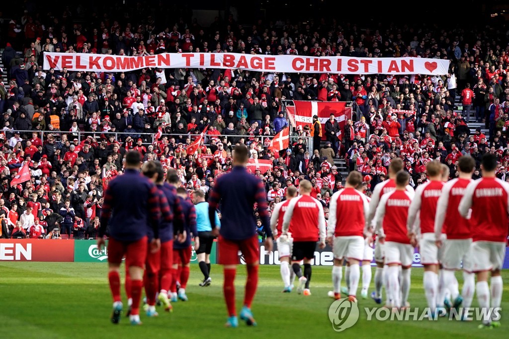 | ▲ 선수단 입장 때 에릭센 복귀 환영 배너 든 덴마크 팬들 [로이터=연합뉴스] |
