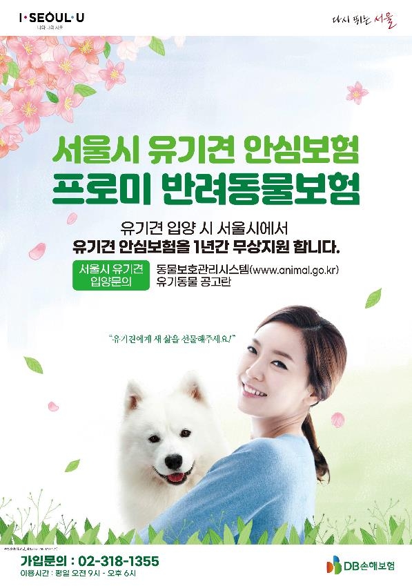 서울동물복지지원센터, 자치구 동물보호센터 및 입양센터 등 총 12개소 기관·단체에서 유기동물을 입양하는 사람에게 DB손해보험㈜의 보험상품 가입을 시가 1년간 지원해 준다. 이 보험은 질병·상해 치료비와 배상책임을 보장한다.
