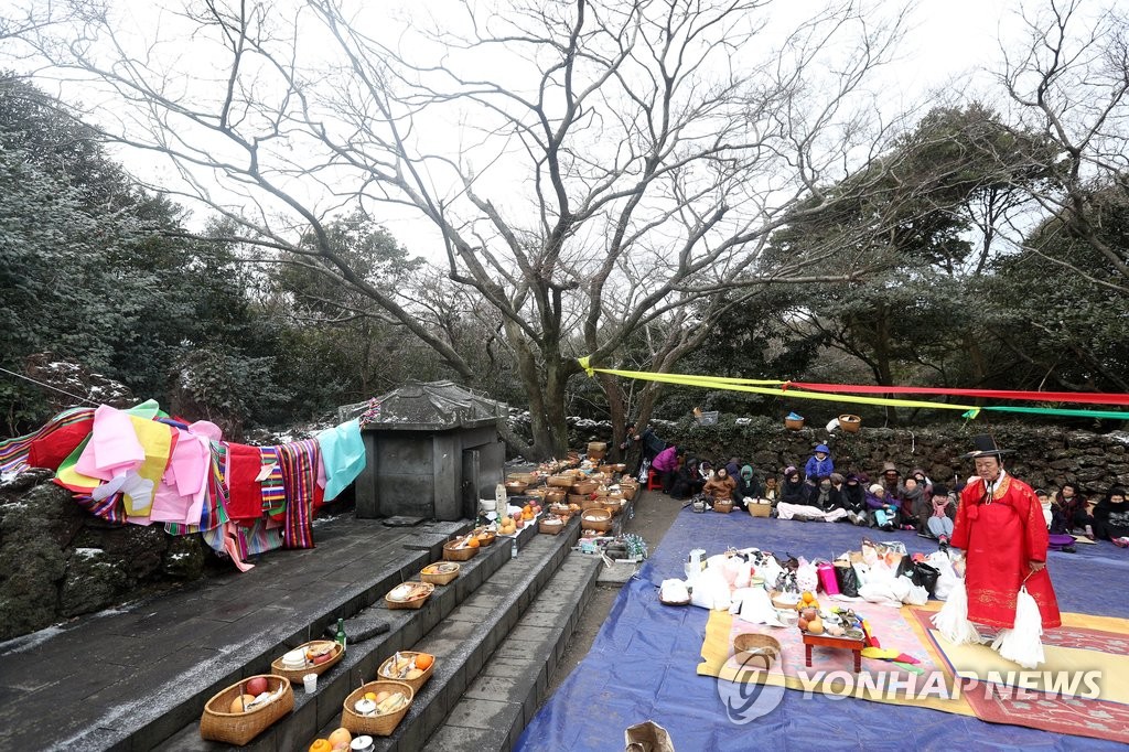 | ▲ 송당 본향당 굿 (제주=연합뉴스) 정유년 정월 대보름을 이틀 앞둔 9일 오전 제주시 구좌읍 송당리 본향당에서 신과세제(新過歲祭)가 거행되고 있다. 2017.2.9[연합뉴스 자료사진] |