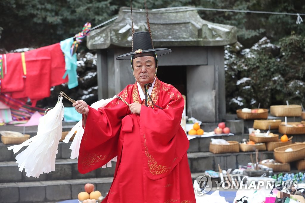 | ▲ 송당 본향당 굿 주관하는 김윤수 큰심방 (제주=연합뉴스) 제주시 구좌읍 송당리 본향당에서 김윤수 큰심방(국가지정 중요무형문화재 제71호)이 연중 가장 큰 굿인 신과세제(新過歲祭)를 주관하고 있다. [연합뉴스 자료사진] |