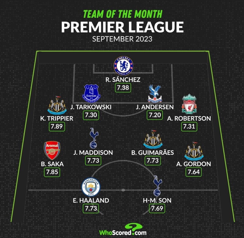 후스코어드닷컴은 9월에 치러진 EPL 경기에서 포지션별로 자체 평가한 평점이 높은 선수 11명을 뽑아서 발표했다.