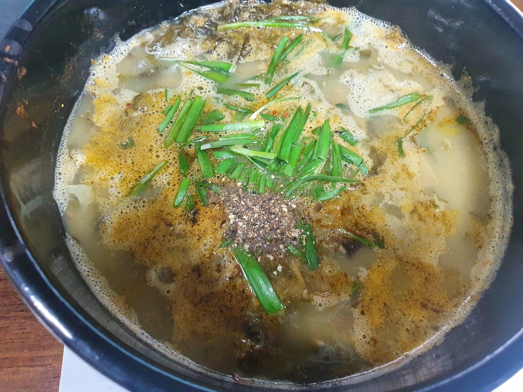 비린내가 거의 나지 않지만 얼얼한 맛이 나는 제피와 마늘, 고추를 조금 넣어서 밥을 말아서 먹으면 든든함이 한나절 간다.