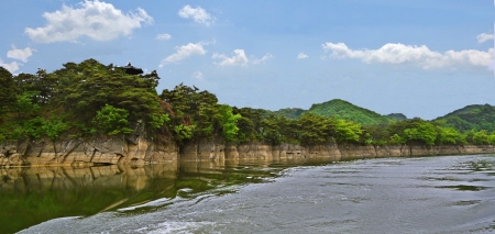 부소담악 매력은 용이 강 위를 스쳐 뻗어나가는 듯한 700m 길이의 기암절벽이다.