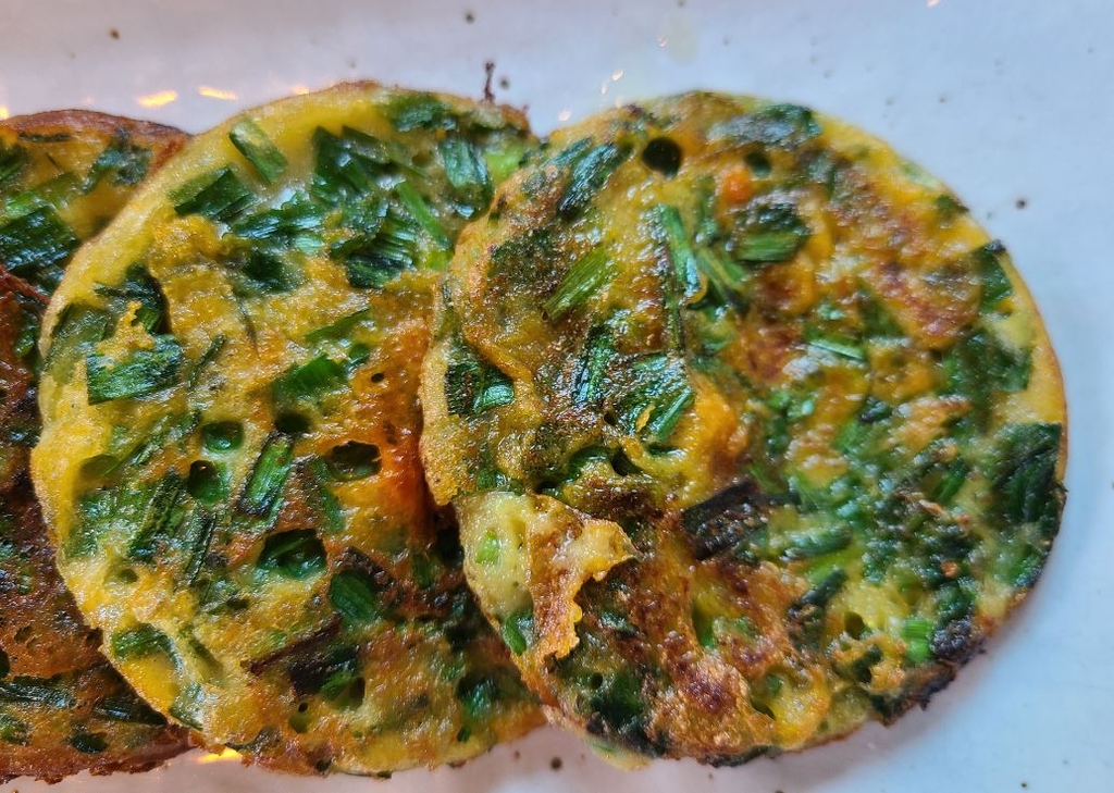겉모습은 일반 파전과 비슷하지만 속속 들어있는 성게알이 눈에 보였다.