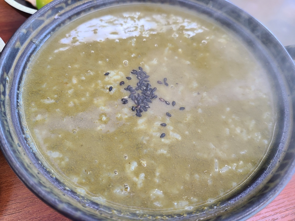 전복을 푹 끓여낸 죽은 전복 내장 등을 넣어 어두운 초록빛이 돌았다.
