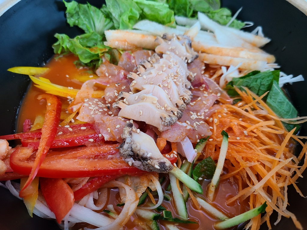 전복물회는 새콤달콤한 육수에 푸짐한 야채가 곁들어져 나왔다.