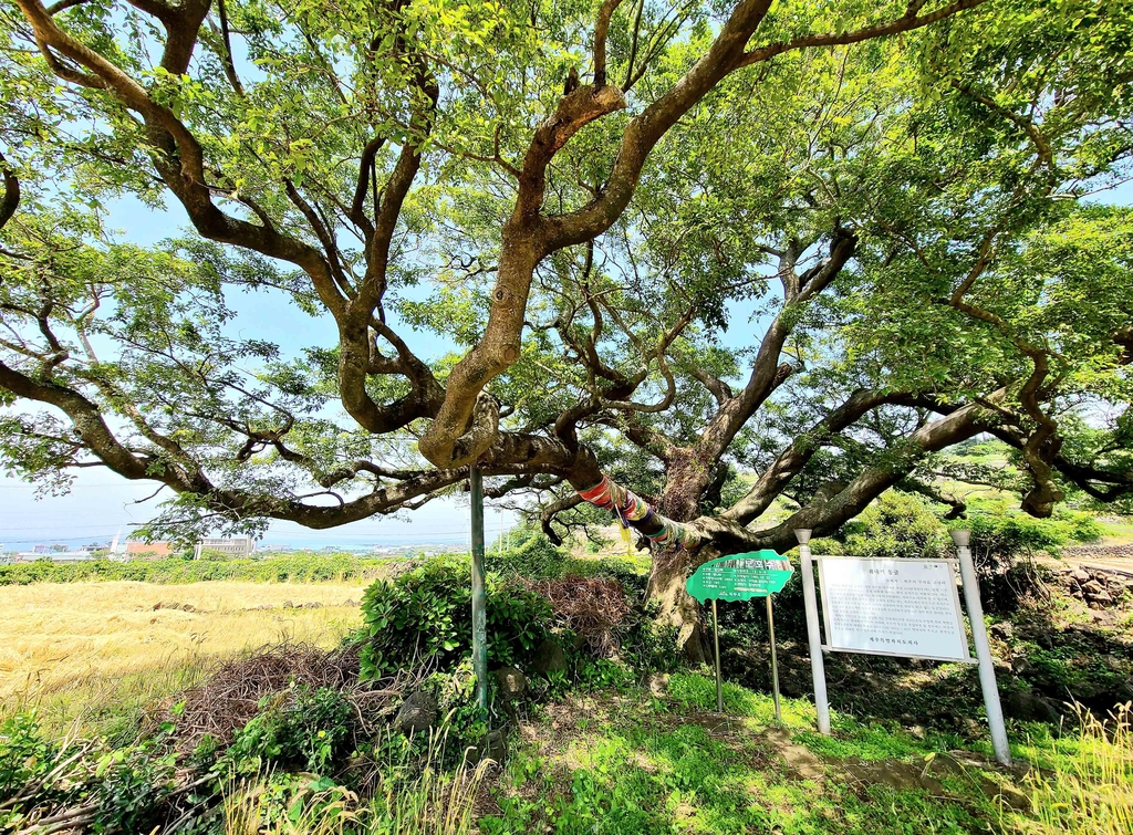 ▲ 400년 가까이 된 팽나무 (제주=연합뉴스) 변지철 기자 = 지난 5월 19일 촬영한 제주시 구좌읍 김녕리 궤네깃당의 신목(神木) 팽나무. 이 팽나무는 수령이 400년 가까이 됐으며 궤네기동굴 전체를 감싸고 있어 신령스러운 분위기를 자아낸다. 2021.5.30