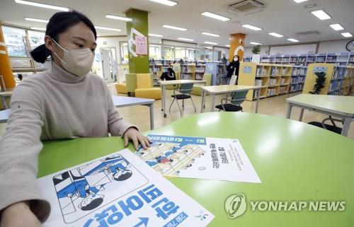 ▲ A librarian places a poster about social distancing rules at Unam Library in Gwangju on Feb. 4, 2022, in this photo provided by Gwangju's Buk Ward office. (PHOTO NOT FOR SALE) (Yonhap)