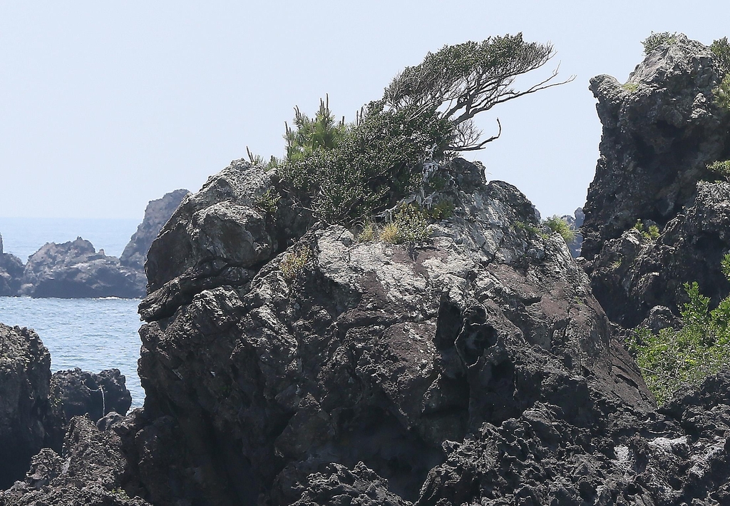 모진 바닷바람을 이겨내고 바위에 뿌리내린 나무 한 그루.