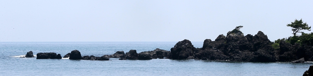 ▲ 제주 대포동 포구 자장코지 (서귀포=연합뉴스) 변지철 기자 = 지난 5월 30일 촬영한 제주 서귀포시 대포동 포구 자장코지의 모습. 마치 바위들이 일렬로 바다를 향해 잠수해 들어가는 듯한 모습이다. 이 중에서도 꼭대기에 작은 나무 한 그루가 자라고 있는 바위가 잠녀당이다. 2021.6.13