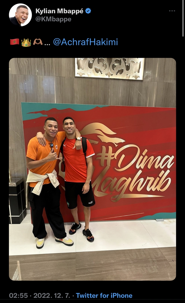 음바페는 하키미와 함께 찍은 사진과 함께 모로코 국기, 왕관, 손가락 하트 이모티콘을 트윗했다.