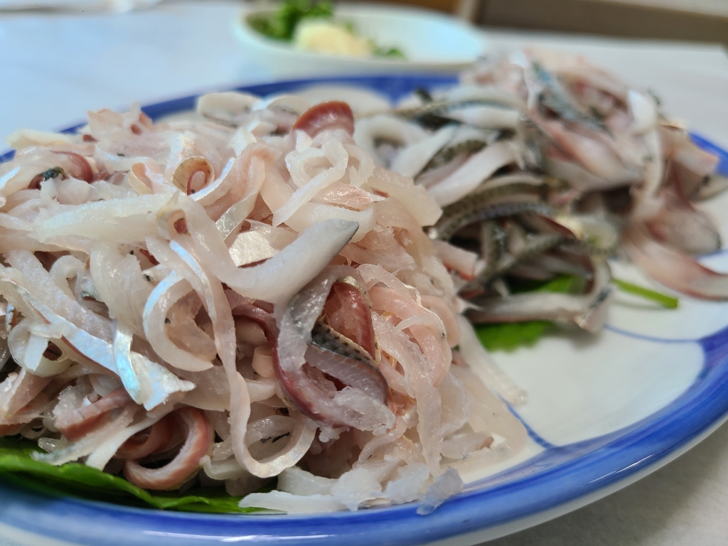 이어 전어회를 주문하자 여러 형태로 썰어낸 전어가 접시에 소복이 올려져 나왔다.