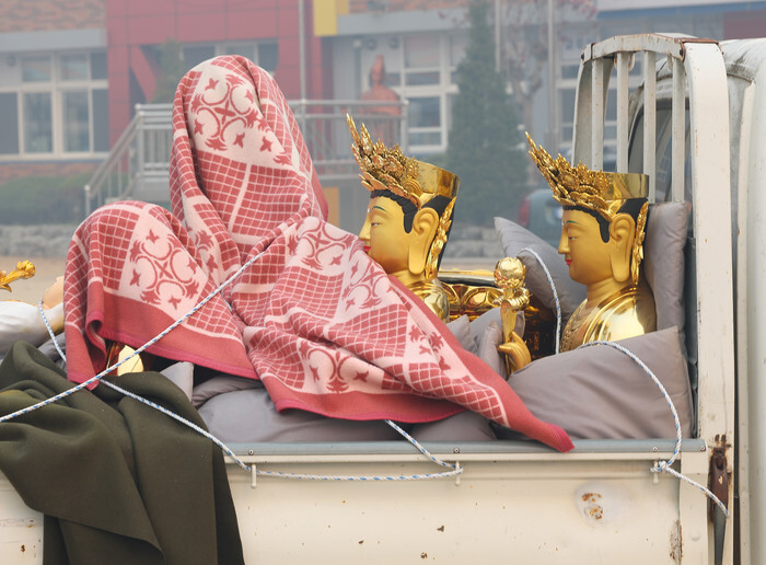 Two Buddhist statues are placed on a truck at the playground of an elementary school in Andong, North Gyeongsang Province, southeastern South Korea, on March 26, 2025, after they were carried out of a nearby Buddhist temple following the breakout of a wildfire the previous day. (Yonhap)