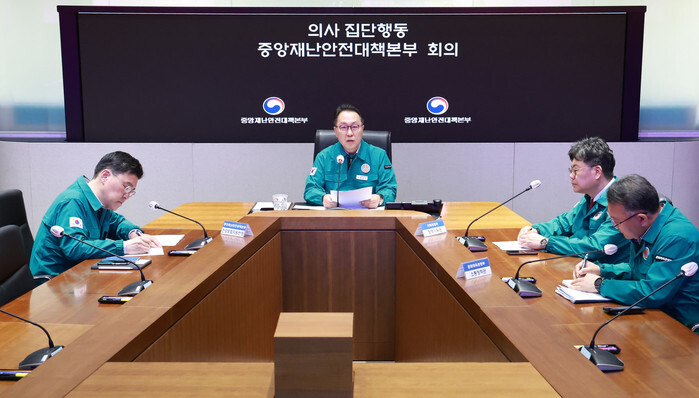 Second Vice Health Minister Park Min-soo (C) attends a meeting of the Central Disaster and Safety Countermeasures Headquarters at the government complex in Seoul on April 10, 2025, about measures to deal with a prolonged standoff between the government and the medical community over a government-initiated medical reform plan. (Yonhap)