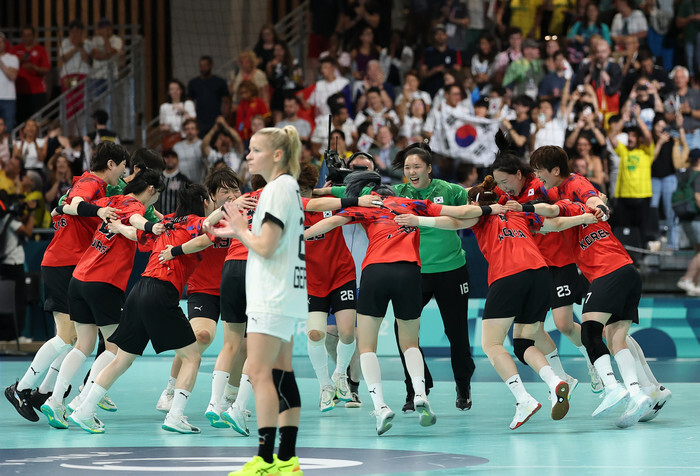 South Korean players celebrate their 23-22 victory over Germany in Group A match in the women's handball tournament at the Paris Olympics at South Paris Arena 6 in Paris on July 25, 2024. (Yonhap)