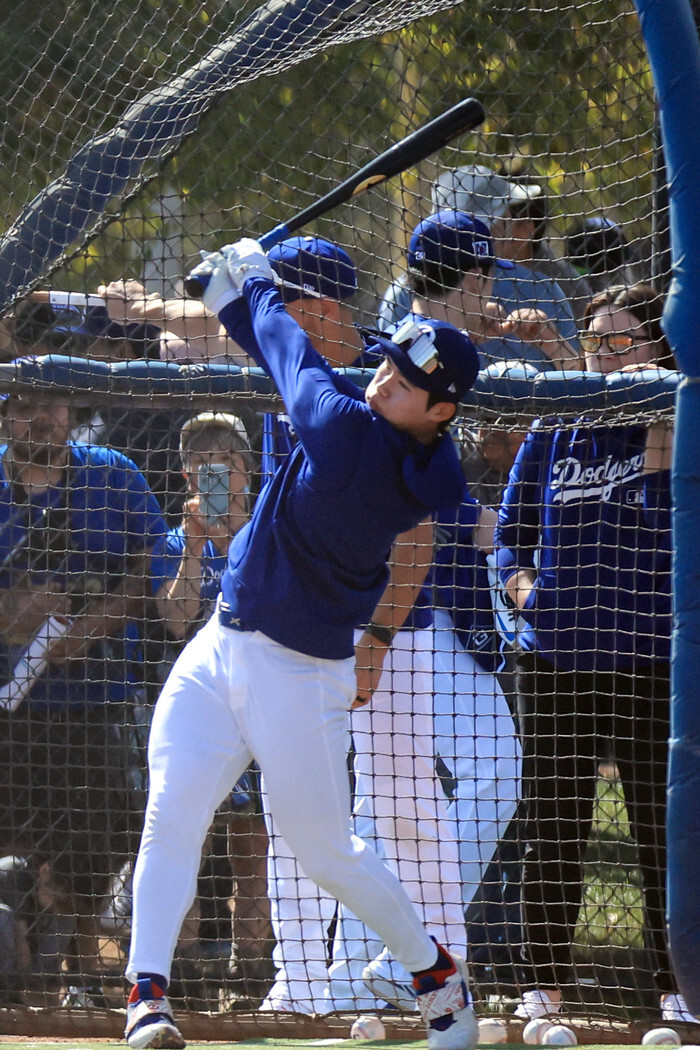 South Korean infielder Kim Hye-seong of the Los Angeles Dodgers takes batting practice at the team's spring training site at Camelback Ranch in Glendale, Arizona, on Feb. 19, 2025. (Yonhap)