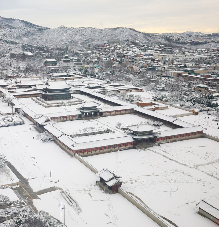 This photo, taken Feb. 22, 2024, shows Gyeongbok Palace, the main royal palace during the Joseon Dynasty (1392-1910) in Seoul, covered with snow, with a heavy snow warning issued for the capital. (Yonhap)