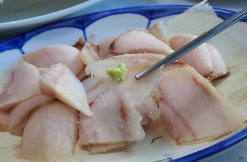 이곳 주인장은 고추냉이나 고추냉이를 섞은 간장과 삼치회를 꼭 같이 먹어야 한다고 강조했다.