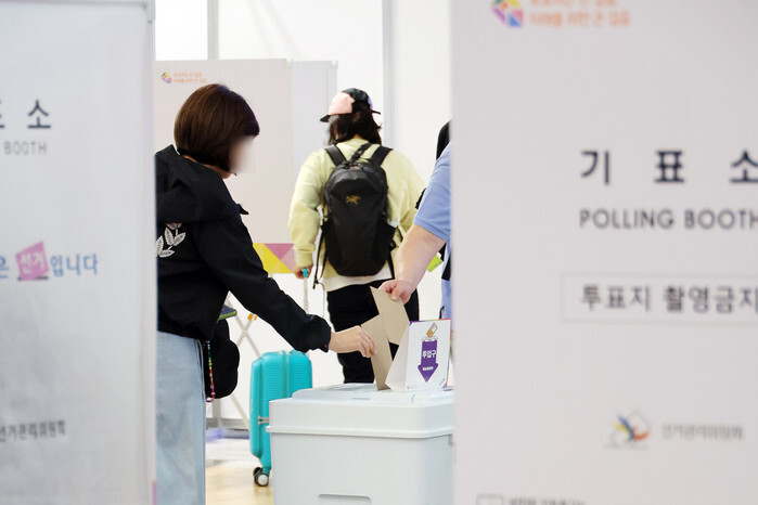 Outbound tourists cast ballots before their departure at a polling station at Incheon International Airport, west of Seoul, on April 5, 2024, the first day of two-day early voting for the April 10 general elections. (Yonhap)