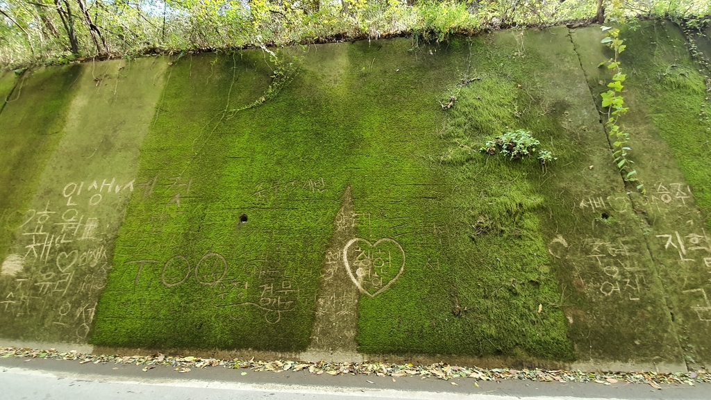 | ▲ 낙서로 훼손된 이끼터널 (단양=연합뉴스) 권정상 기자 = 충북 단양군 적성면 이끼터널 옹벽이 손 닿는 곳까지 낙서로 가득 차 있다. 2021.10.29 jusang@yna.co.kr |