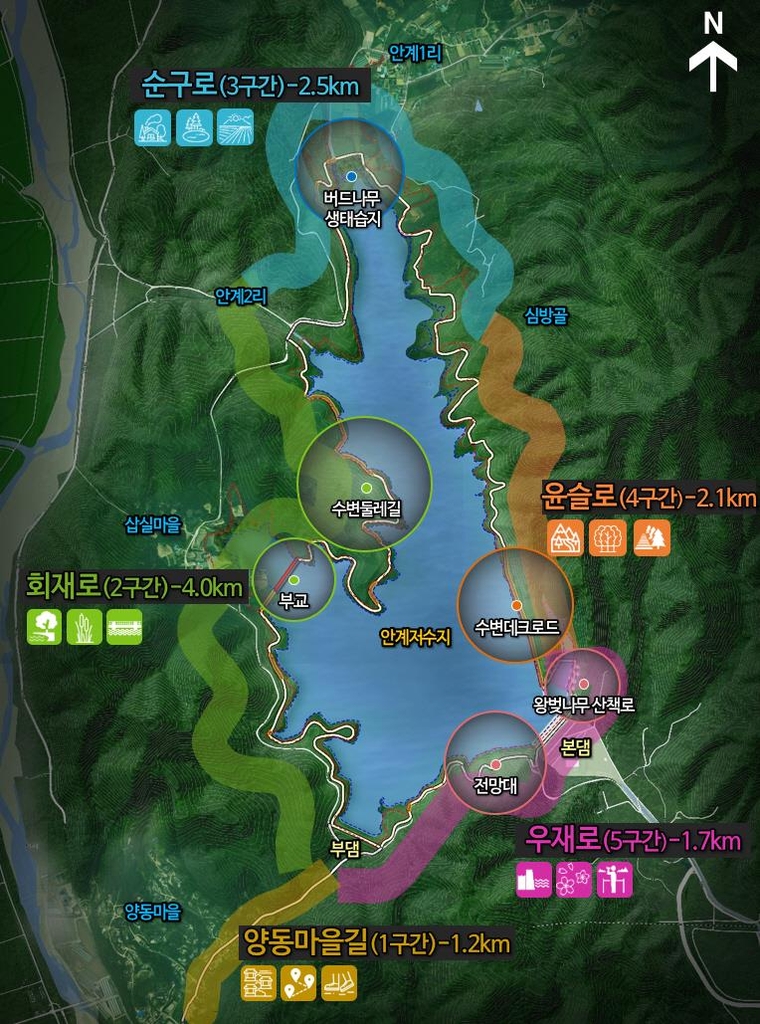 시는 강동면 안계저수지 주변 11.5㎞ 구간에 62억원을 들여 둘레길과 데크, 전망대, 쉼터, 부교 등으로 구성되는 '안계댐 둘레길'을 조성한다고 7일 밝혔다.