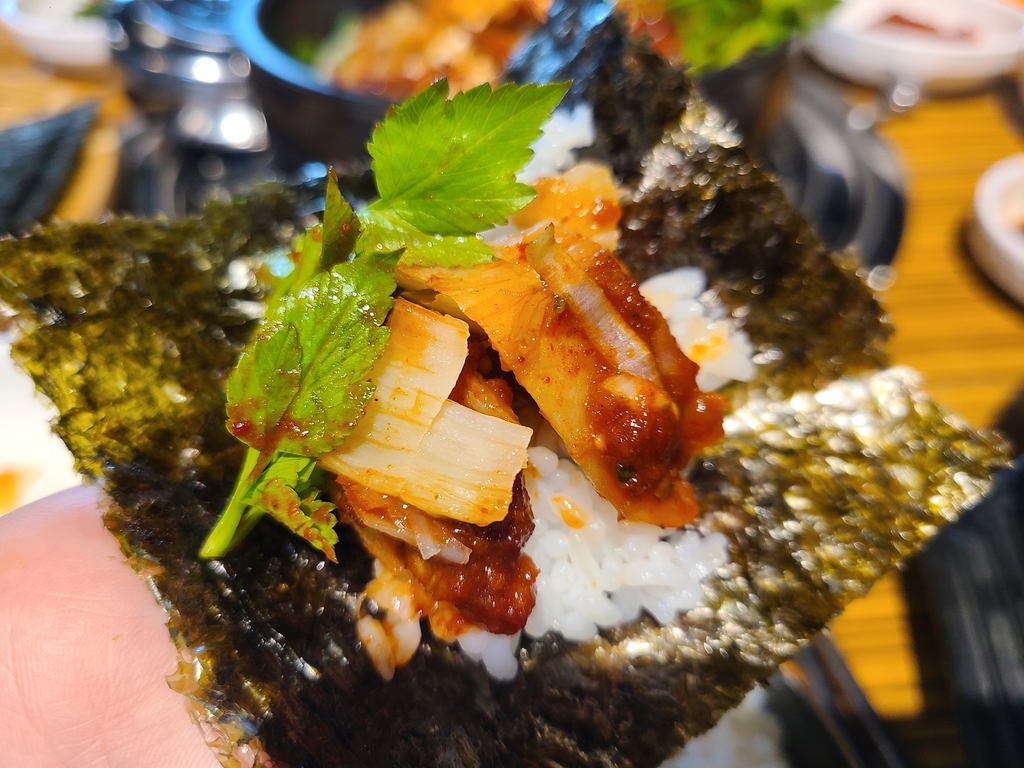 잘 구워진 김에 흰 쌀밥, 양념한 대구살을 올려 쑥갓으로 마무리하니 금상첨화였다.