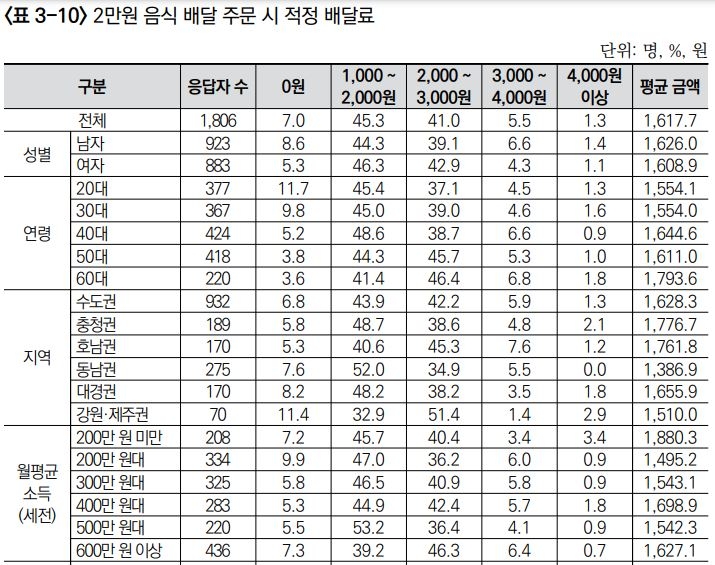 | ▲ 응답자 성별, 연령, 지역, 소득 수준별 평균 적정 배달료 [한국농촌경제연구원 누리집 갈무리. 재판매 및 DB 금지] |