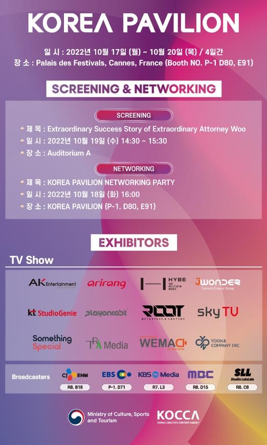 한국공동관에는 KBS미디어, MBC, CJ ENM, SLL중앙, 스카이라이프TV, KT스튜디오지니, 하이브엔터테인먼트 등 주요 방송사와 방송콘텐츠 제작·배급사 총 17곳이 참여한다.