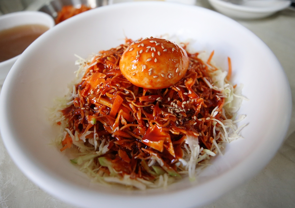 (인천=연합뉴스) 김상연 기자 = "초고추장에 양배추, 오이, 당근 채와 콩나물을 국수와 한데 비벼 먹는 맛은 텁텁하지 않아서 좋다. 냉면처럼 올라앉은 삶은 달걀 반쪽도 구색을 갖춘다."